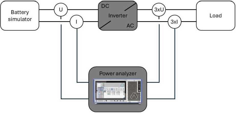 위 그림은, 3상 인버터 측정을 위한 기본 설정을 보여줍니다. 인버터의 전기적 전력과 효율성을 측정하기 위해서는